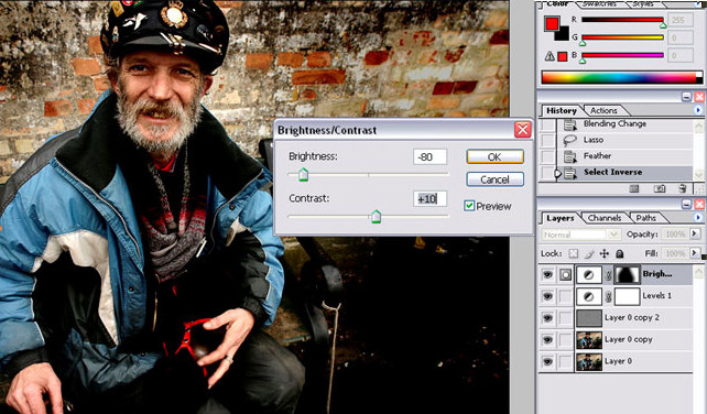 Når du har valgt din feather, skal du derefter invertere din ’selection’. Dette kan gøres nemt, ved at bruge genvejen ’ctrl, shift, I’. Nu har du din selection som skal gøres mørkere. Det gøres ved at lave et nyt justeringslag, som skal være ’Brightness/contrast’. I dette tilfælde satte jeg ’brightness’ til -80 og ’contrast’ til +10.