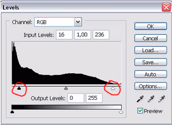 3. Levels. En vigtig del af det meget kontrastholdige fotografi. Du laver et nyt justeringslag i lagvinduet, hvor der er en knap til dette formål. I denne lille menu der kommer frem, vælger du ’Levels’ – og sætter pilene i hver side en smule ind i hver side, så billedets skyggeområder bliver mørkere, og højlysene lysnes.