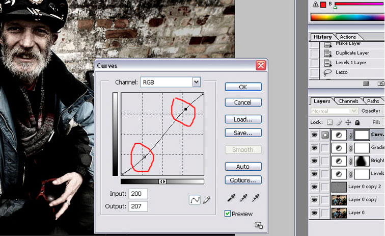 Igen laver du et nyt justeringslag, denne gang med ’Curves’, hvor der nu er poppet en dialogboks frem. For at fremhæve kontrasten, skal skyggeområderne være mørkere og højlysene lysere. Jeg sætter normalt mine curves på følgende måde;