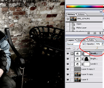 - Derefter har du et smukt s/h-foto med masser af kontrast. For at få en smule farve tilbage i fotografiet ændrer du opaciteten på laget hvor gradient map ligger. Her kan du lege dig frem til hvad der passer til motivet. Jeg satte opaciteten til 70%.