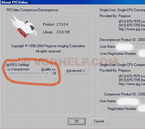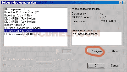 Select Video->Compression and select PICVideo MJPEG Codec. Hit Configure