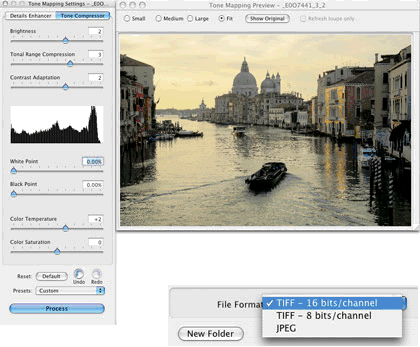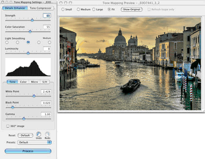 Tone Mapping Settings palette on the left lets you adjust the settings and select the tone mapping method: the first tab is for the Details Enhancer method, the second tab for the Tone Compressor method.