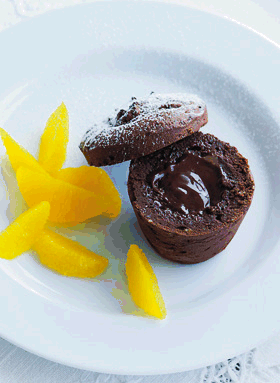 Servering: Ca. ½ time inden kagerne skal serveres, tages de direkte fra fryseren og bages i ovnen ved 220° varmluft i 15 min. Tag kagerne ud af ovnen og lad dem stå i formene i 10 min., før du forsigtigt tager dem ud. Pynt med sigtet flormelis.