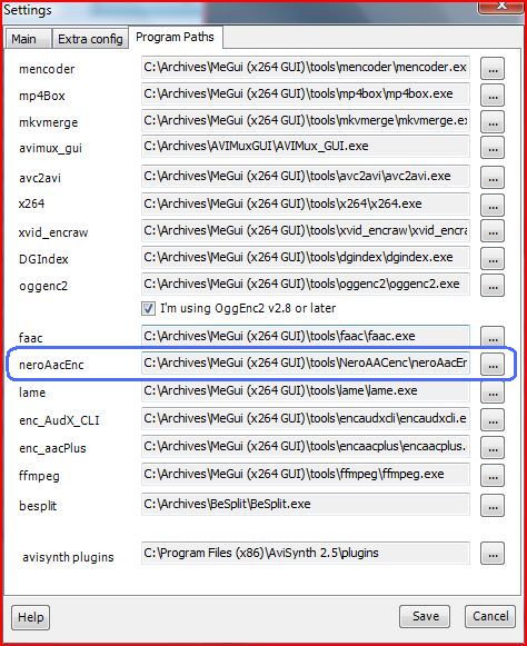 Once you have downloaded the files, place them in a TOOLS\NeroAACenc folder of your MEGUI install (the Tools folder will be created after MEGUI updates). Just create the NeroAACenc folder. You must also point your MEGUI configuration to that folder for the Nero audio. To do so, select TOOLS -> Settings from menus, and then the Program Paths tab. Click the button next to NeroAACEnc and browse to the "neroAacEnc.exe" executable.