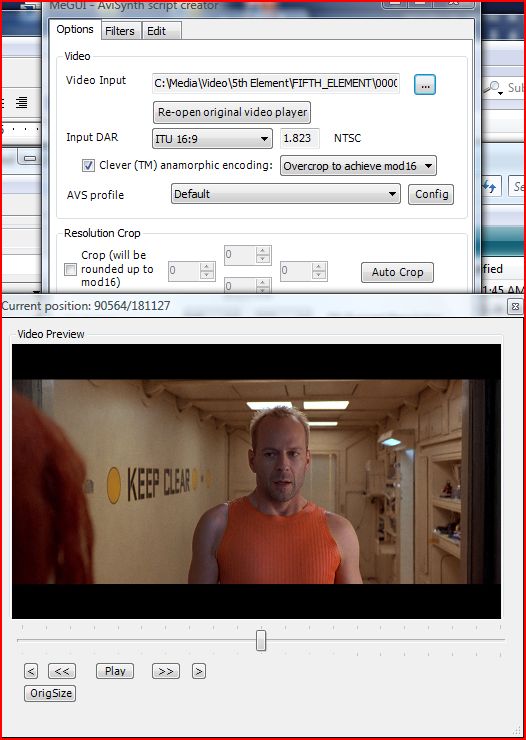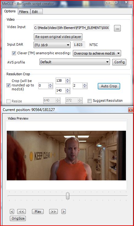 Once I select my Source .D2V file in the AVISynth Script Creator screen I see a preview window. The preview window size can be changed by dragging the window edges. Bigger sources makes the window unwieldy so I would suggest you make it small enough so that you can see the MEGUI interface underneath. Leave the preview window open as we'll be modifying some elements on the preview screen.