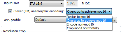 The Input DAR (Display Aspect Ratio) should be displayed. In my case, my input is 16:9. Directly below that is a checkbox for 'Clever (TM) anamorphic encoding'. This option allows you to simply encode the video as is without any drastic resizing. This is desirable so that you do not have to unnecessarily resize your video. The encoding process will embed the Aspect Ratio of your video when it is encoded so that it is stretched back to the proper proportions during playback. I would highly suggest you select this option. For the Anamorphic option, I always choose "Overcrop to achieve mod 16" to avoid any resizing at all. If your a bit anal about having any of your video cropped, you can choose "Resize to Achieve Mod 16". MEGUI will require that your video's dimensions are divisible by 16. Choose on of those two options (resize to mod 16 or overcrop to mod 16).