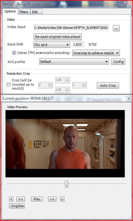 For my example, I'm going to browse to my Blue-Ray rip of The Fifth Element. The file has an .M2TS extension, so it's not an 'allowed' input type for MEGUI by default. However I have FFDShow installed and the Haali Media Splitter, meaning the file can be viewed with DirectShow. As you register files with a media player, they may show up in the list. Once you select your source file, assuming it is DirectShow compatible, it should show up in with a preview window. If you do not get a preview window, and you see an error, that would indicate your source isn't setup properly for DirectShow. Post your issue in the main forum in that case.
