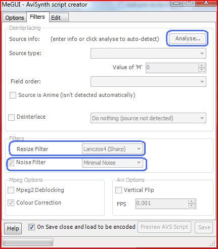 From here you should analyze your source video for interlacing and field order. This is important and not something you should skip. I can't say how many times I've encoded a project that seemed to be entirely progressive only to find a scene that was mixed. Getting the field order right is also important. Note that if your source is Anime/CGI then you should check the option "Source is Anime (isn't detected automatically)" before analyzing your material. Once the analysis is completed you can also choose what Resizing and noise filtering options you want. Since we are using the 'Clever Anamorphic Encoding' option, we won't be resizing anything. This option is applied only if you are actually resizing the video. If you selected "Resize to achieve Mod 16" on the Options tab then I would suggest you select Lanczos4Resize as your resizing option. That would give you the sharpest resize with the least loss of detail. I would suggest you always leave "Minimal Noise" selected, even for 'clean' sources. For older source material, I would suggest you select "Little Noise". Anything beyond that can have a noticeable softening affect which you may find unpleasant. Experiment here to find what you see as acceptable. This setting can have a very beneficial effect on Bit Rate usage even when the noise isn't immediately obvious to you. Below that you also have options for Mpeg2 Deblocking and Colour Correction. The Deblocking option is useful if your source has obvious macroblocking (this would sometimes be the case on previously encoded MPEG material like home burned DVD or SVCD's). The Colour Correction option ensures the colors are calibrated properly. I tend to avoid both of these filters as I have found little use for them.