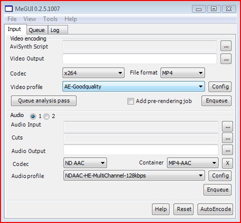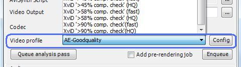 For this example, lets choose AE-Goodquality. It's a good tradeoff for excellent quality although it requires high cpu specs. I would highly suggest you have decent CPU power (read: dual core) to use the AE profiles with the settings I'll be suggesting. Choose the profile from the Video Profile dropdown, and then click the Config button.