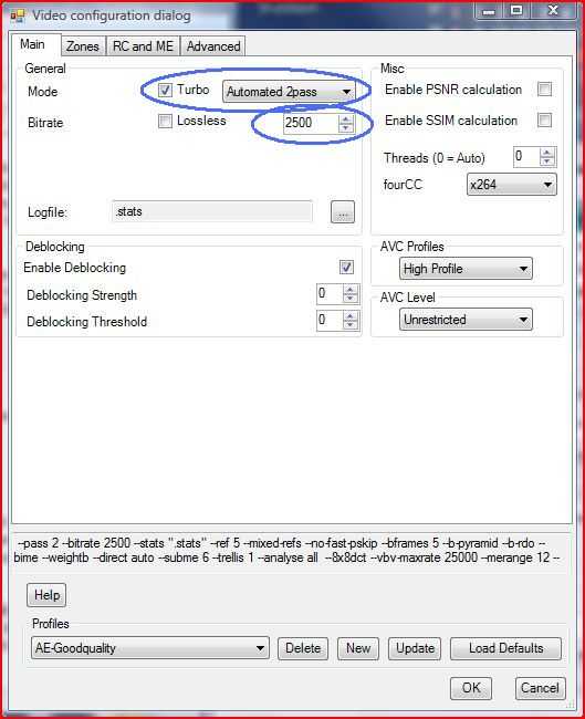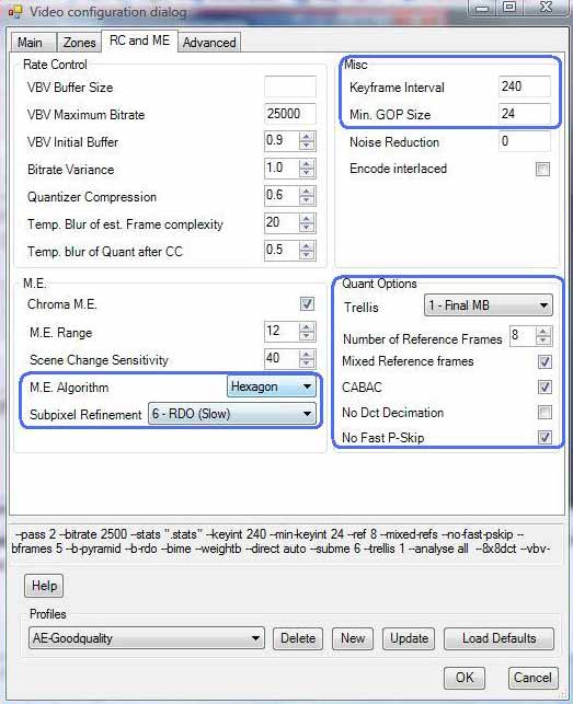 These sections contains the guts of the H264 codec. These settings also have a huge impact on the speed that your PC will encode your output. The items of interest are highlighted.