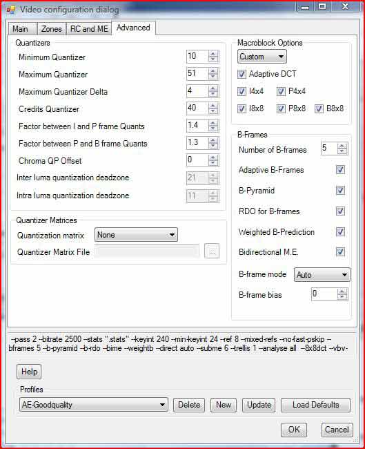 If you are encoding video for an iPod for example, you would want to choose an iPod compatible profile. If you have an older PC (non-dual core) then I would suggest you use CE-Mainprofile. If you have a faster CPU, or Dual-Core, then I would suggest you use the AE profiles. I always use AE-Maxquality or AE-Goodquality with a tiny bit of tweaking.