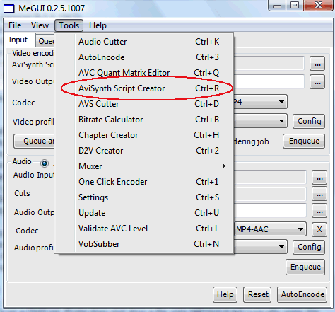MEGUI itself only accepts input from AVISynth files (.AVS). AVISynth in turn can accept input from a multitude of input sources. I assume the reason for this is just to ensure they have consistent input on a known interface. Makes troubleshooting and coding easier I suspect. No worries if your AVISynth impaired however, as it has a handy AVISynth Script Creator that will do the dirty work for you. Lets get started...