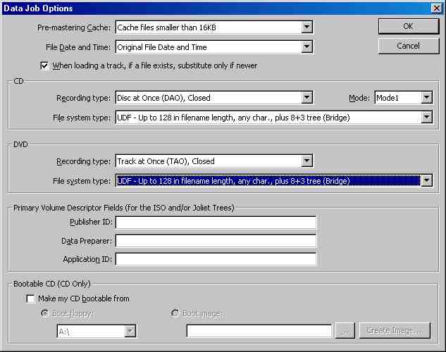 For DVD Blank Media types set RECORDING TYPE to Track at Once (TAO), Closed or Disk at Once(DAO) Closed Depending on Burner used. FILE SYSTEM TYPE set to “UDF – Up to 128 in Filename Length, any char, plus 8+3 Bridge”