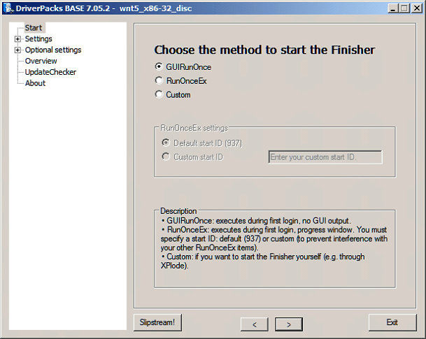 9) In the below screen you can select when you want the Driverpacks Finisher to run. Read the description for each option. GUIRunOnce is selected by default.
