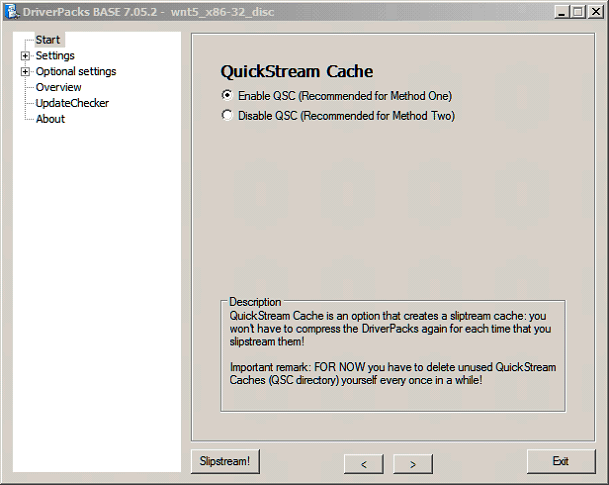 With DPsBASE 7.05.2 and earlier there is another peculiarity we recently discovered. Suppose you are using the very same Mass Storage Pack between slipstreams of the various Windows versions you have stored on Hard disk. You can slipstream all XP versions one after the other, and you will be fine, and the QSC cache saves time. HOWEVER. You should clear the QSC\Mass storage cache folder when you next want to slipstream a different Operating System.