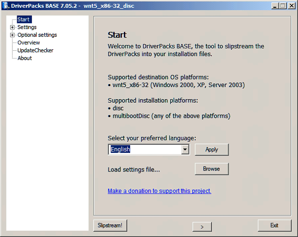 On the below screen you can select your language, load any previously saved settings, go straight to slipstream (if your settings are already set), make a donation (A lot of work went into this utility), or progress to the next settings step (right arrow).