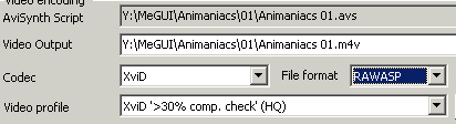 After the AviSynth Script Creator window closes, it will be entered in the AviSynth Script box on the Input tab. Below that is the output file. Click the button to the right of it to change the location or name. Select the dropdown menu next to Codec and set it to XviD. File Format should be set to AVI, MKV, or RAWASP (MP4). To select a Video Profile, determine what percentage of original DVD's bitrate will be used for the XviD encode. If you're not sure, compare the combined size of the VOB files to the intended final size of the XviD. The profiles are named by what amount of compression they're designed for. For example, XviD '>90% comp. check' means it's for encodes that are 90% as big as the original or more. Find the largest percentage that's smaller than or equal to the amount of compression your encode will have. Each compression level will have a fast and HQ option. As the names suggest, one will give you faster encodes, and the other a little higher quality.