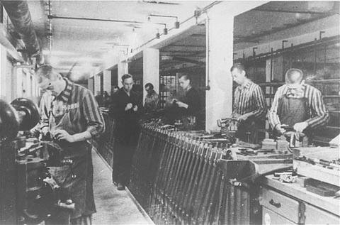 Prisoners making rifles at the Dachau prison camp.